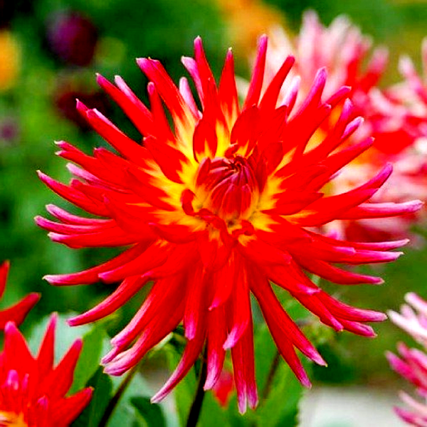 Dahlias grow from underground tubers and typically reach heights of 1-6 feet, depending on the variety. They bloom from midsummer until the first frost, making them valuable for extended garden color. The plants prefer full sun and well-drained, fertile soil. In colder climates, the tubers must be lifted and stored indoors during winter. Dahlias are excellent for cut flowers and are popular in both cottage gardens and formal landscapes. There are over 40 species and thousands of cultivars, making them one of the most diverse flowering plants available to gardeners.